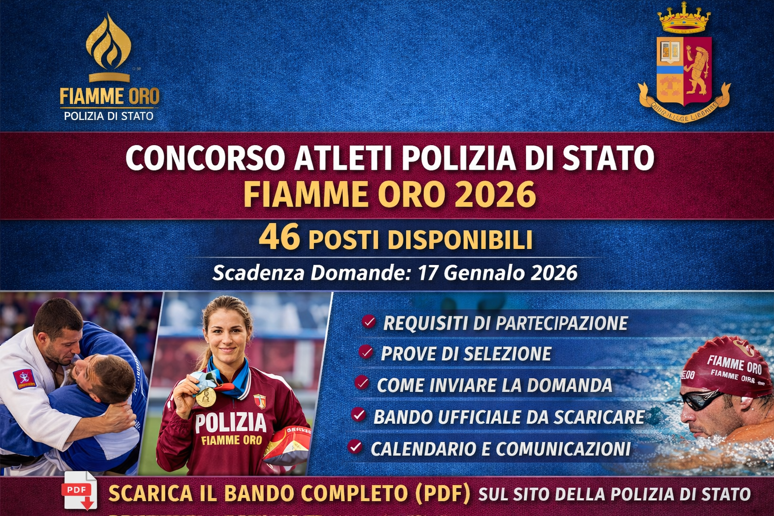 È stato ufficialmente pubblicato il Concorso Atleti Polizia di Stato Fiamme Oro 2026, finalizzato al reclutamento di 46 atleti da inserire nei gruppi sportivi delle Fiamme Oro della Polizia di Stato.